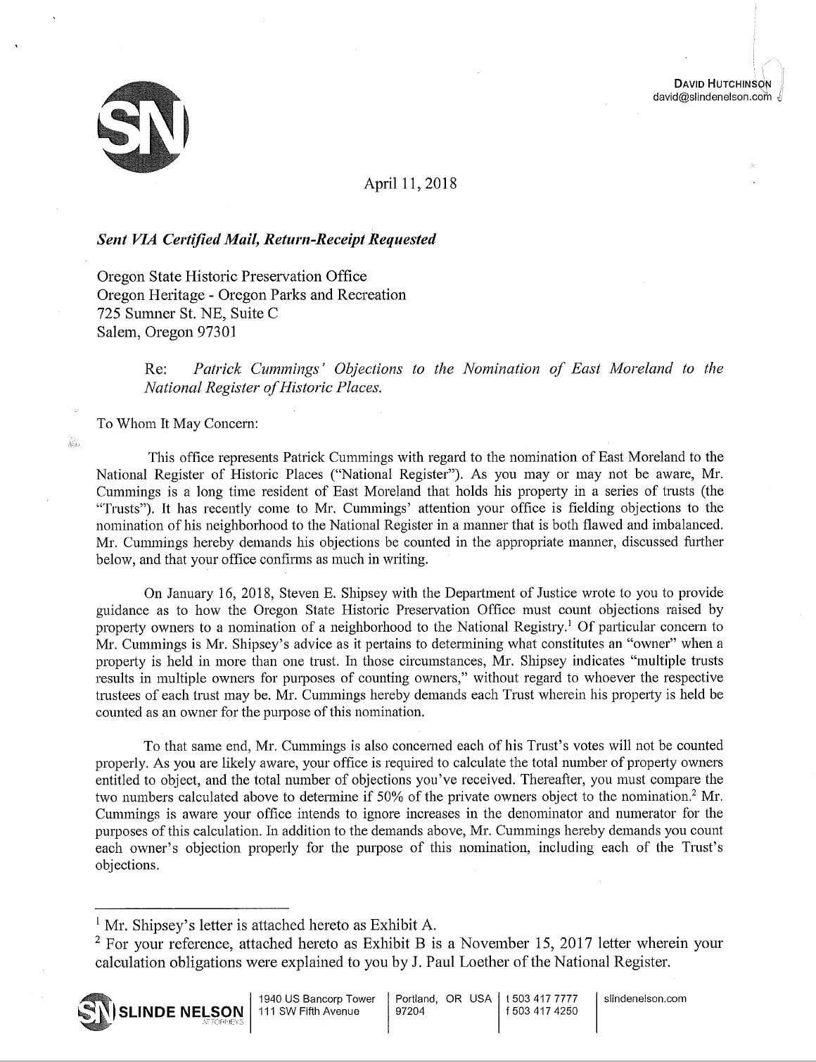 On April 11, after Mr. Cummings had created his objection trusts (but before he formally submitted objections), he had his attorney demand the SHPO count these objections but then requested the SHPO not disclose the information. In the letter, shown below, Cummings’ attorney states: “Mr. Cummings has good cause to request you not disclose his information as part of any public records request related to this nomination.”